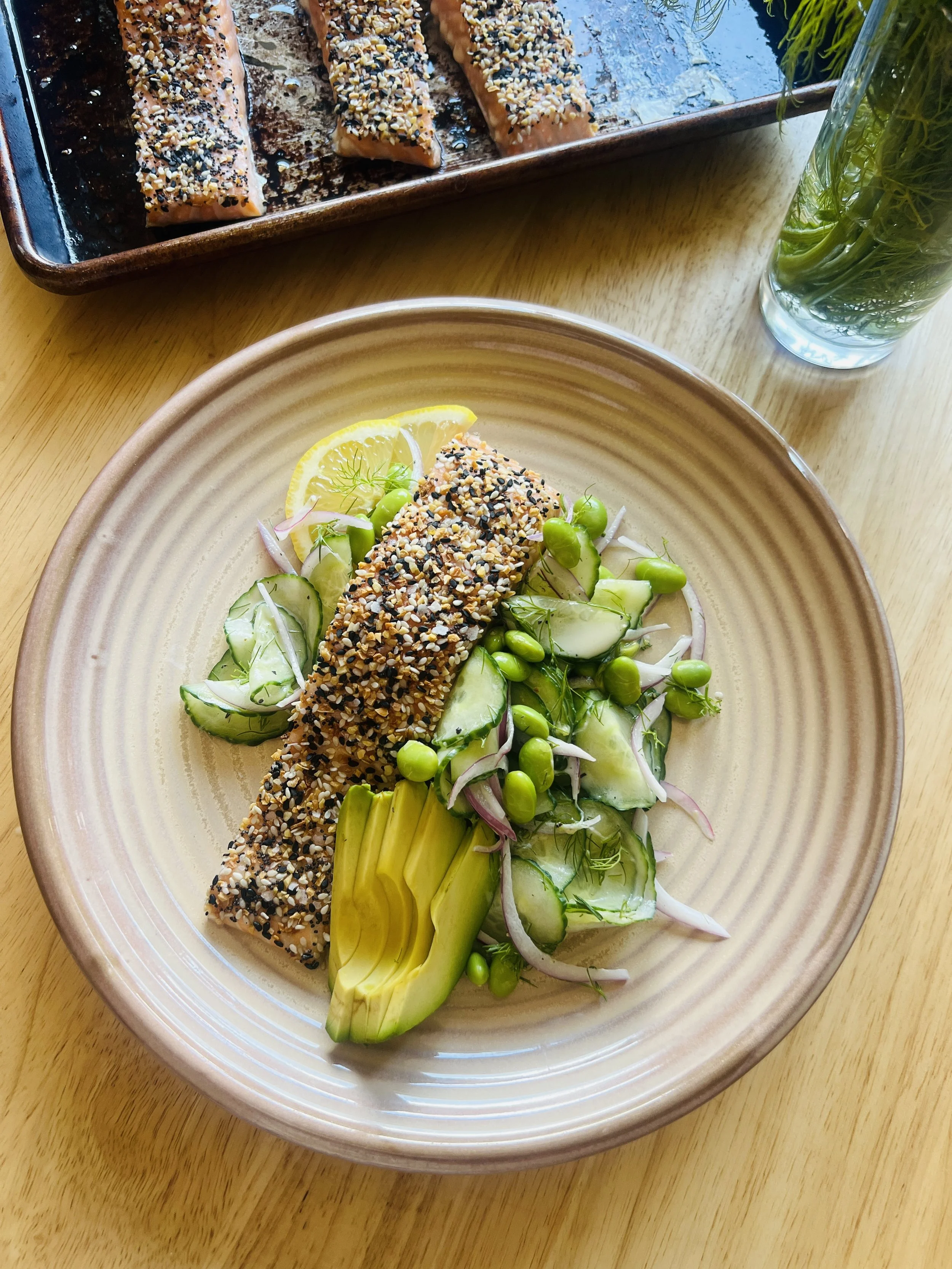 We are using a very simple, foolproof cooking method for our salmon, a 350-degree oven with just a drizzle of avocado oil so the skin doesn’t stick to the sheet tray. I got the BBQ cut salmon, which means thick cut; it was 1.5 inches thick. Put the salmon flesh side down onto a bed of everything bagel seasoning, and press gently. Carefully lay the salmon onto a lightly oiled sheet pan, skin side down (seasoning side up). Put in the oven for 14 minutes. The salmon was PERFECTION. Really be mindful of how thick your salmon is and adjust the cook time accordingly. If you have a thin piece of salmon, it may only take half the time! Opt for slightly undercooked salmon rather than overcooked.