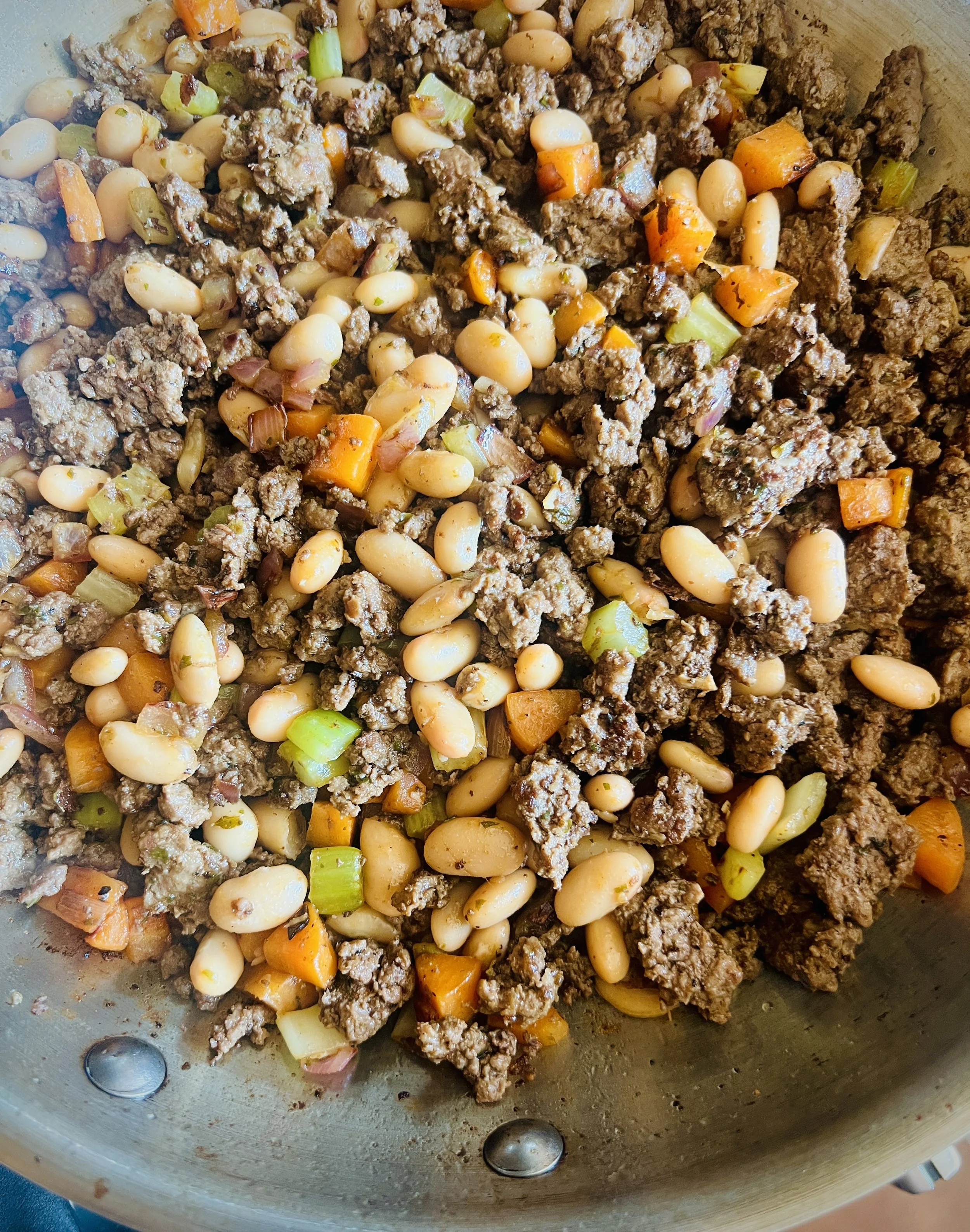 Let’s recap. We cooked the meat, cooked the veggies, and added the beans. All of those have been salted and peppered separately. Salt every step of a recipe; those are the rules.