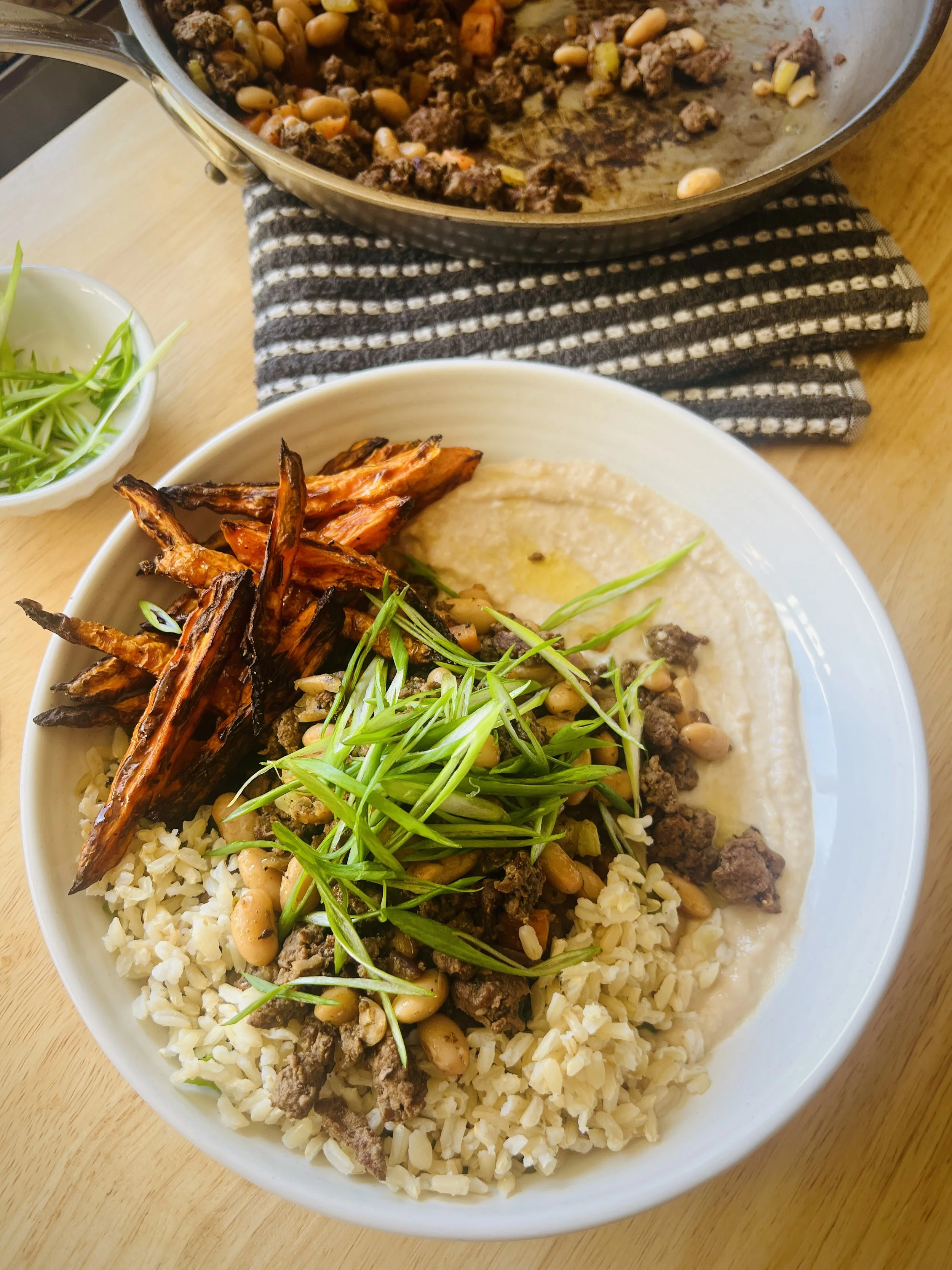 My Organ Forward Beef Bowl (OFBB) includes: browned venison/beef & organs with mirepoix, white beans, carrot fries, rice, and coriander yogurt hummus, topped with a slew of thinly sliced green onions, oh, and a drizzle of lemon oil for good measure.