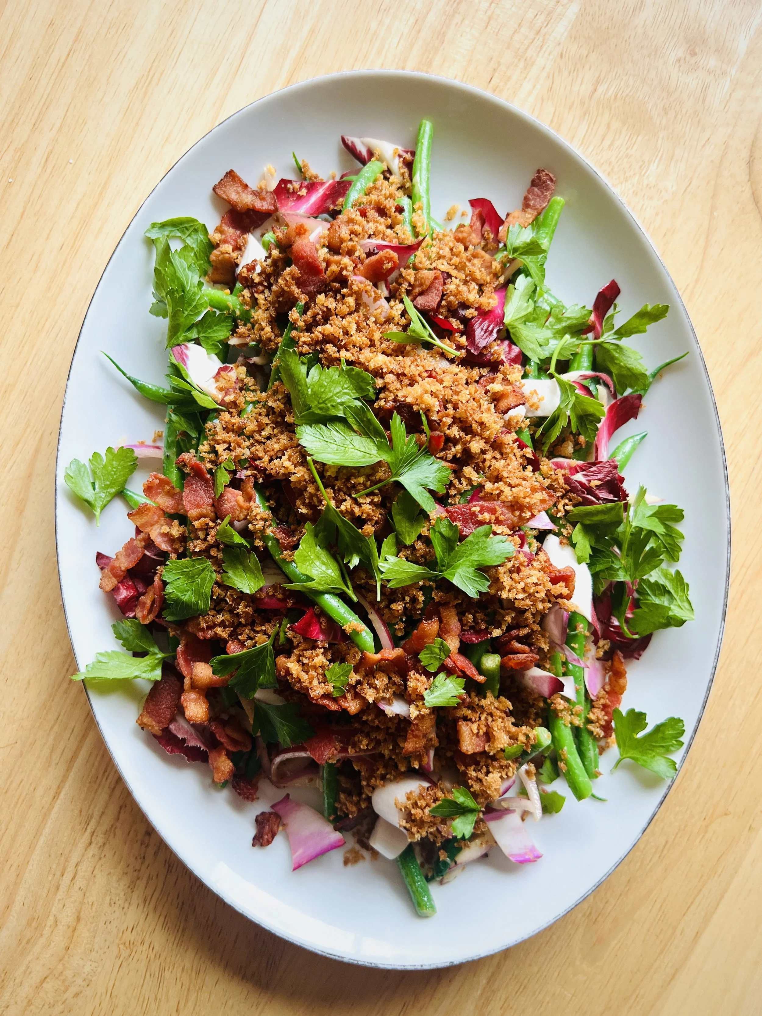 Pro-tip for making the salad in advance. Assemble everything up until the breadcrumbs. Store in the fridge loosely covered with plastic wrap. When you are ready to serve, pull from the fridge and top with the breadcrumbs.