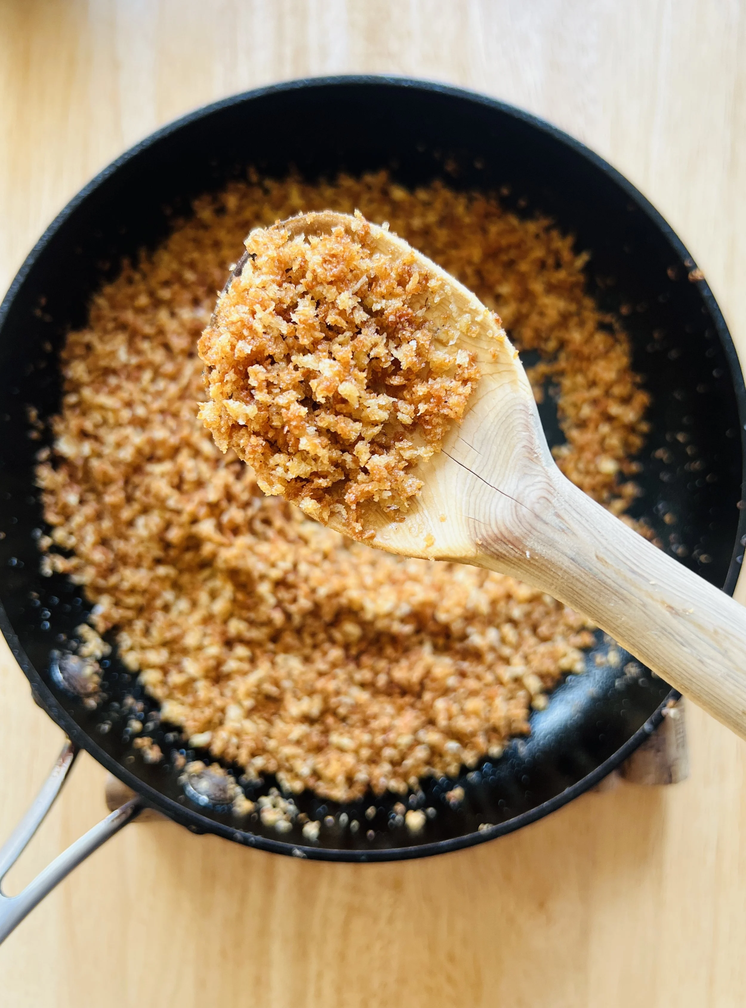 Sprinkle bread crumbs over the top before serving. For an extra nice moment, grate some fresh Parmesan cheese over top!