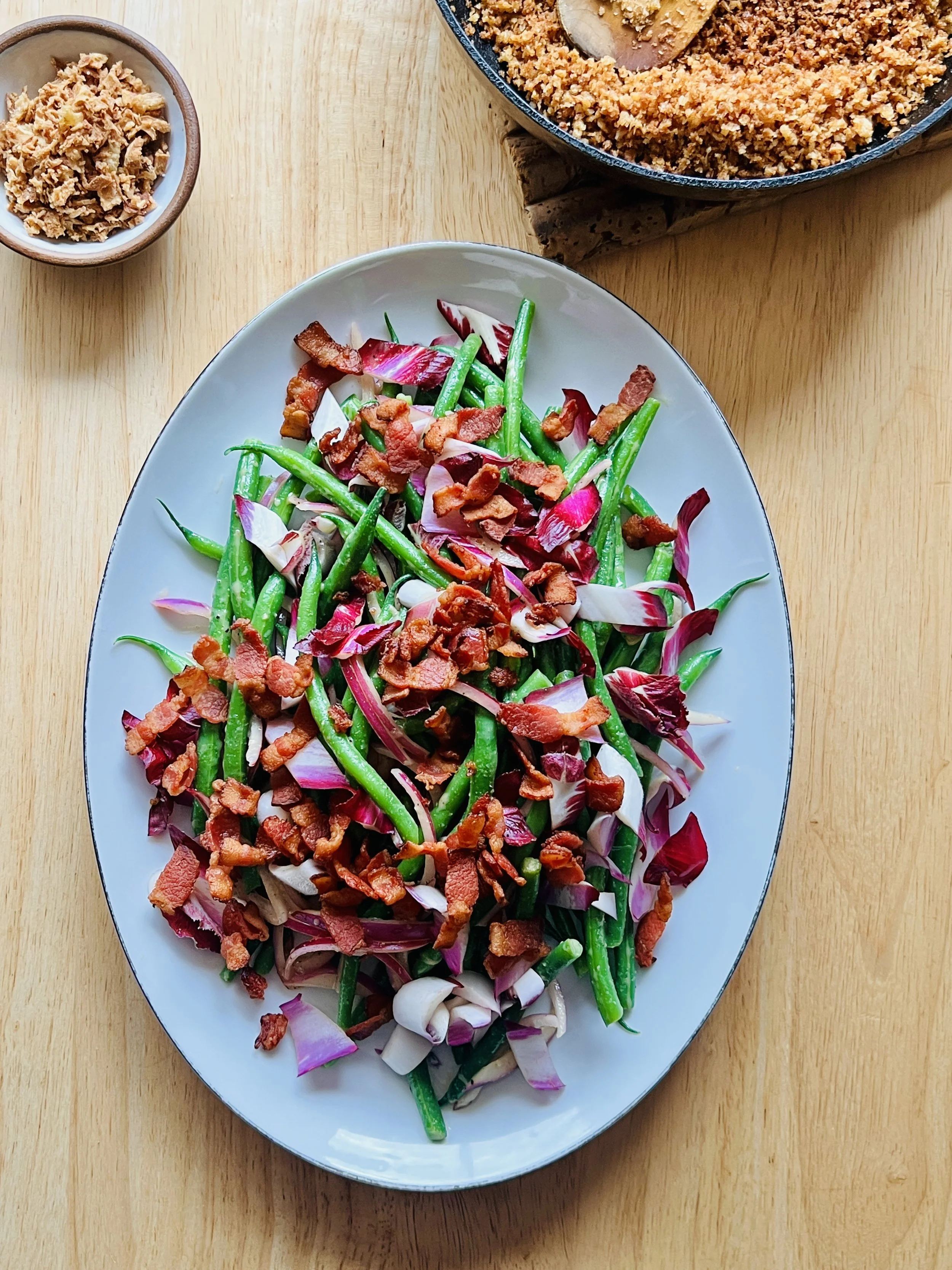 I am choosing a green bean salad over a green bean casserole any day of the week. And who is even thinking about canned green beans when you see how absolutely stunning a fresh green bean looks? Vibrant, colorful, fresh, bright with a little savory bacon action and a nice contrast of texture with the breadcrumbs. Visually stunning and impeccably tasting.