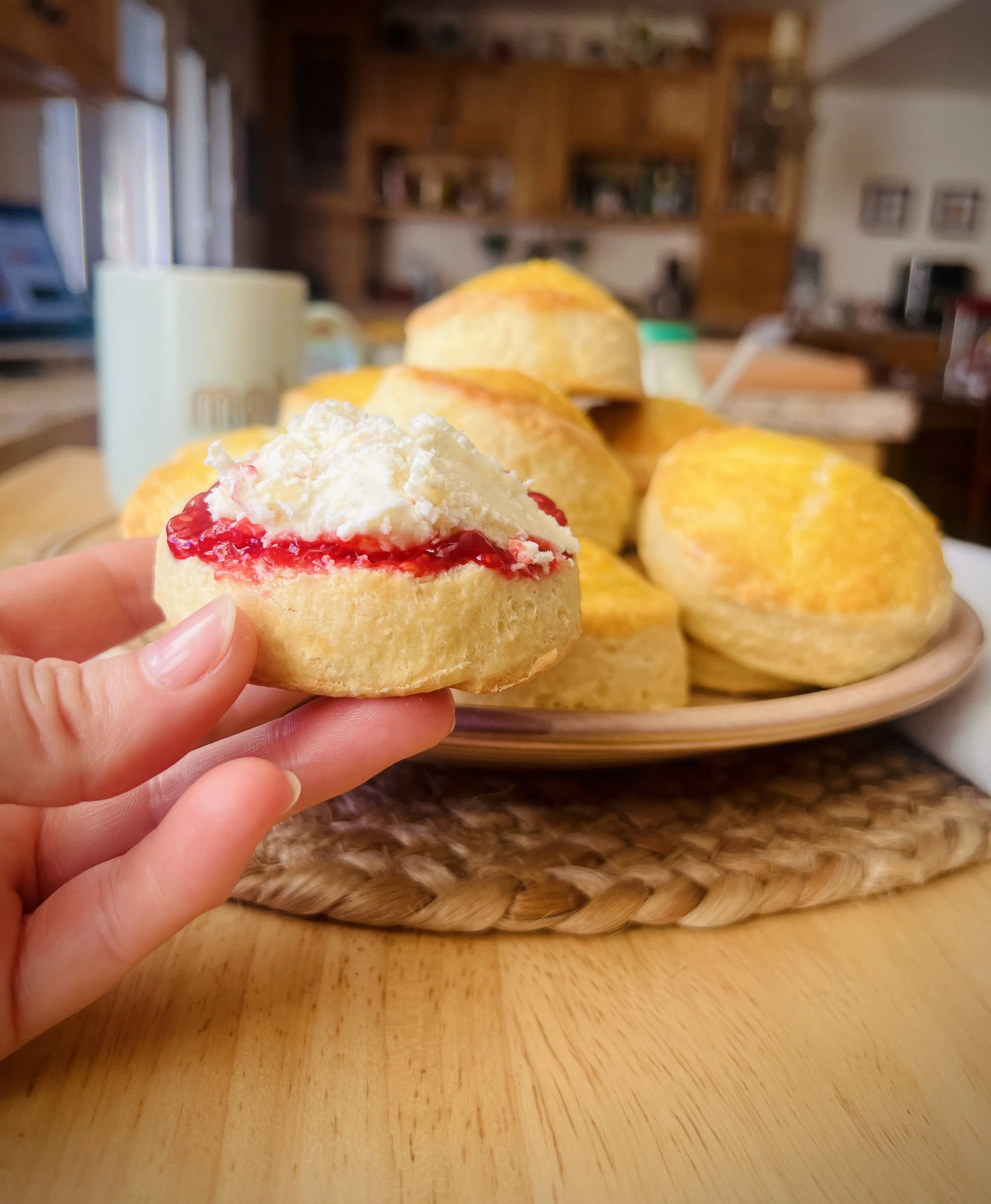 What are we going to put on these beautiful, perfectly fluffy British-style scones? But of course, clotted cream and jam🥰.