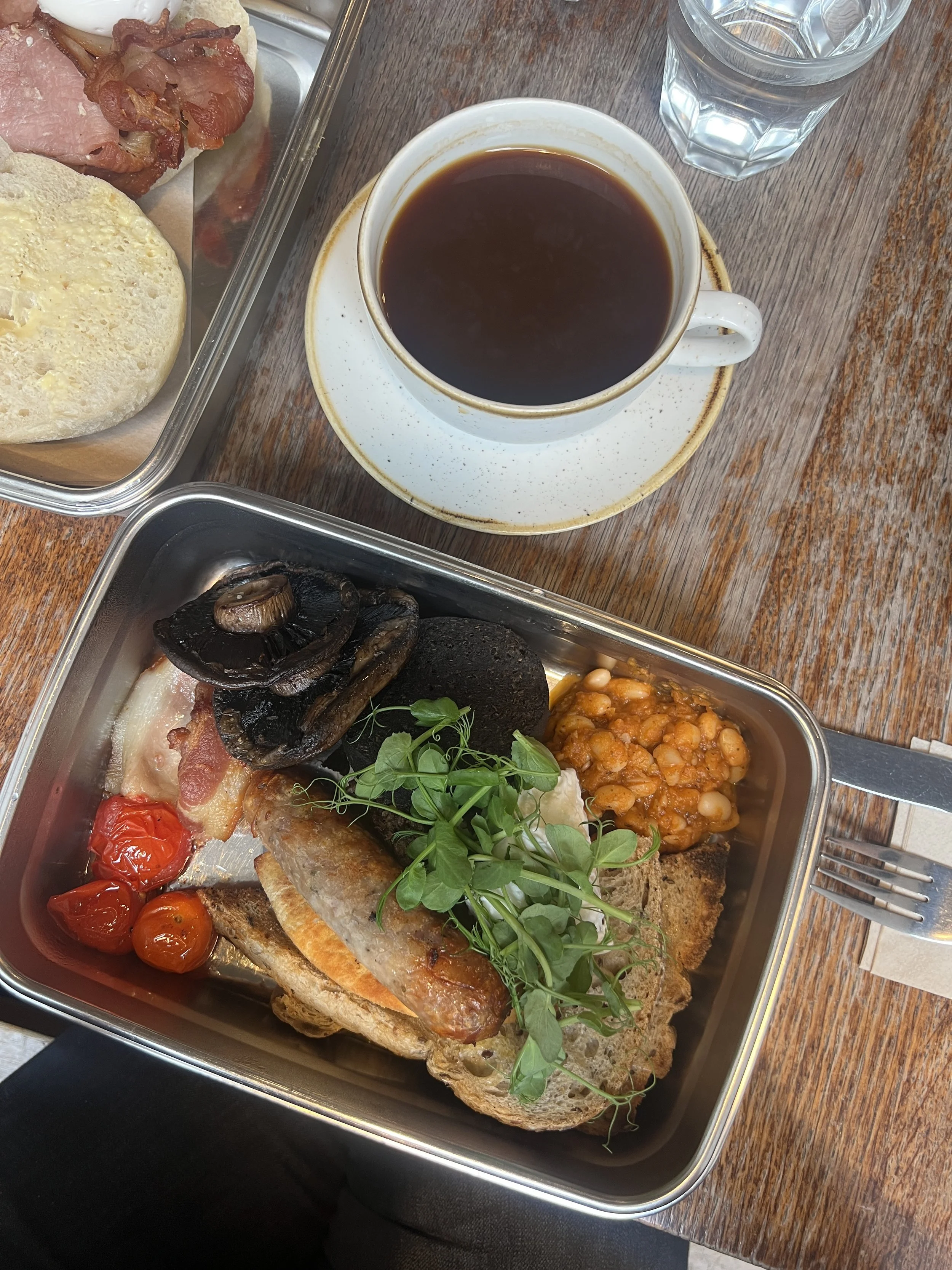 The Full Scottish includes: Sausage, black pudding, back bacon, haggis, poached egg, baked beans, toast, potato scone, roasted tomatoes, and mushrooms. I also had one of the best Americanos of the trip; it had rich chocolatey notes and was absolute perfection. Back to the Haggis, cause y’all are dying to know. Haggis is a savory sausage-like situation, flavored with lots of pepper and even more herbs. It is hearty, nutty, and filling. I find it delicious. Eat with some pea shoots and a poached egg to cut through the powerful flavor profile. Do you really want to know what it’s made of? It is made from the heart, liver, and lungs of a sheep, chopped very fine and cooked with lots of herbs and spices, and mixed with oats. Who is hungry! If you can get past what it is made of, there is nothing not to like about haggis. If you can’t just eat your toast and more haggis for the rest of us.