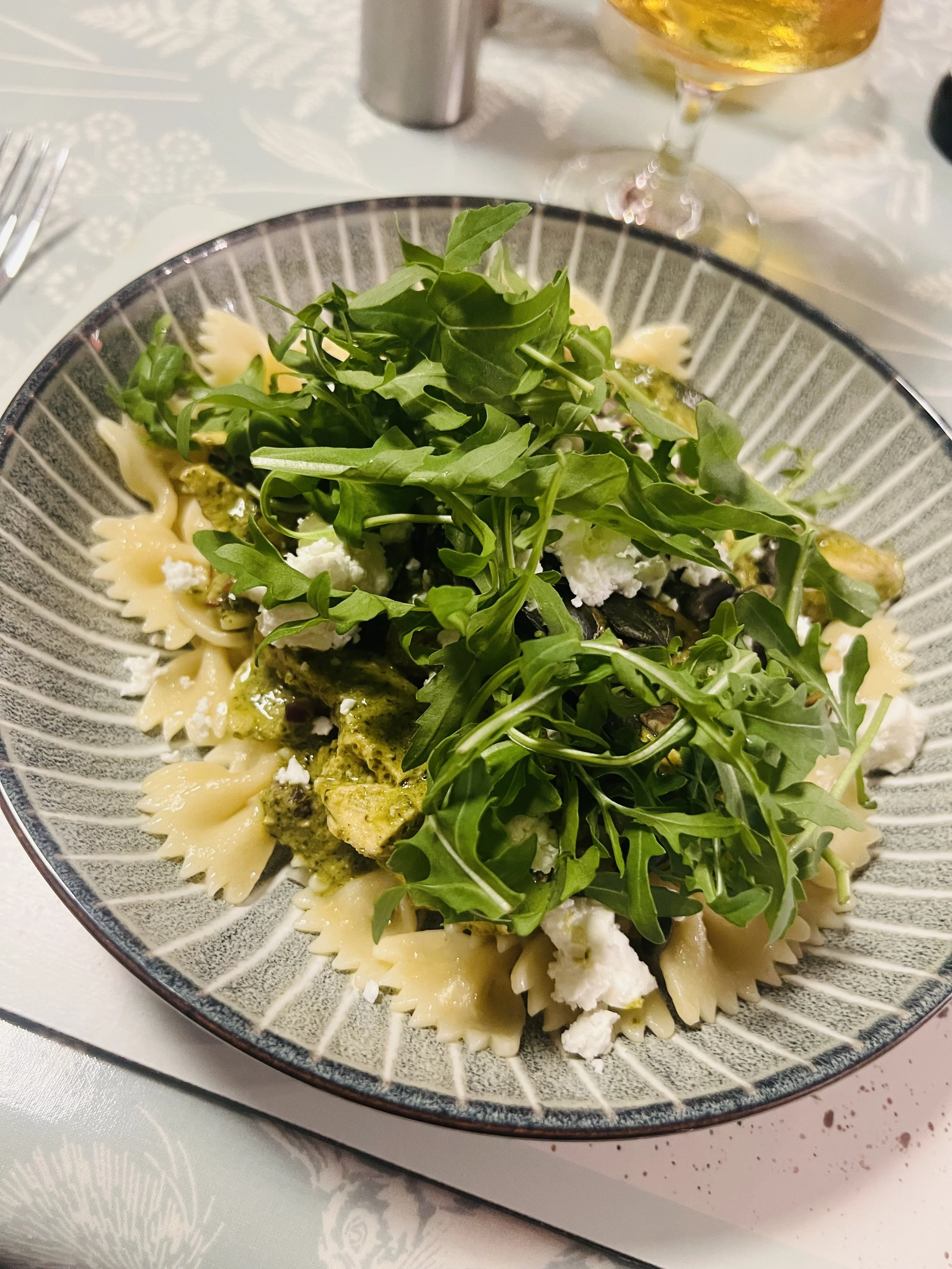 A pesto pasta with sautéed mushrooms, courgette, and onions, topped with feta, pepitas, and a palmful of arugula. Simple. Yet when were are all looking around the table while eating marveling at how incredible it was. Thanks, Rach❤️. Good food doesn’t have to be complicated.