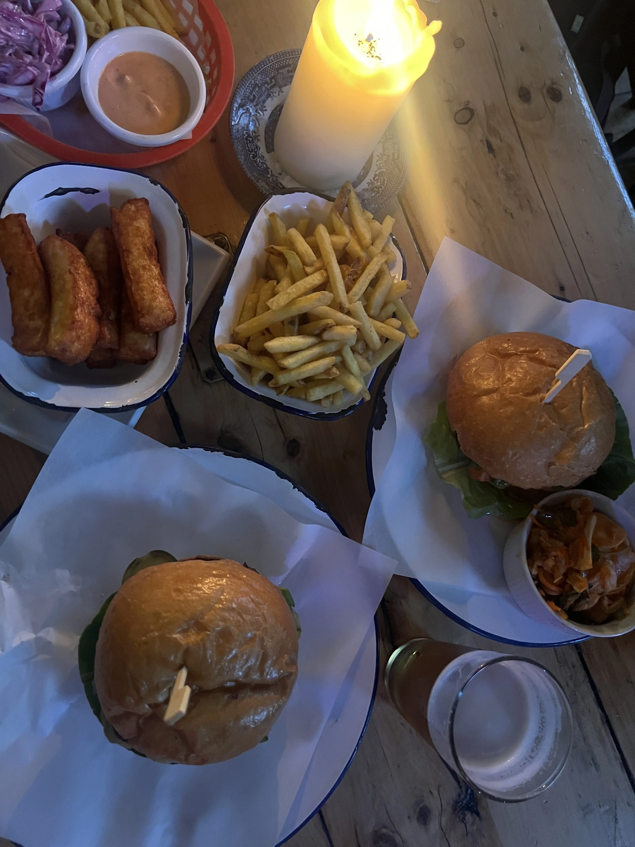 We made it to dinner! By the skin of our teeth and a very decent walk, touring where the ‘real’ people live. It was burgers, fried chicken, beers, chips, and halloumi fries tonight. In a trendy, moody bar in Leith with a sign that said Don’t be a dick. Worth trekking to.
