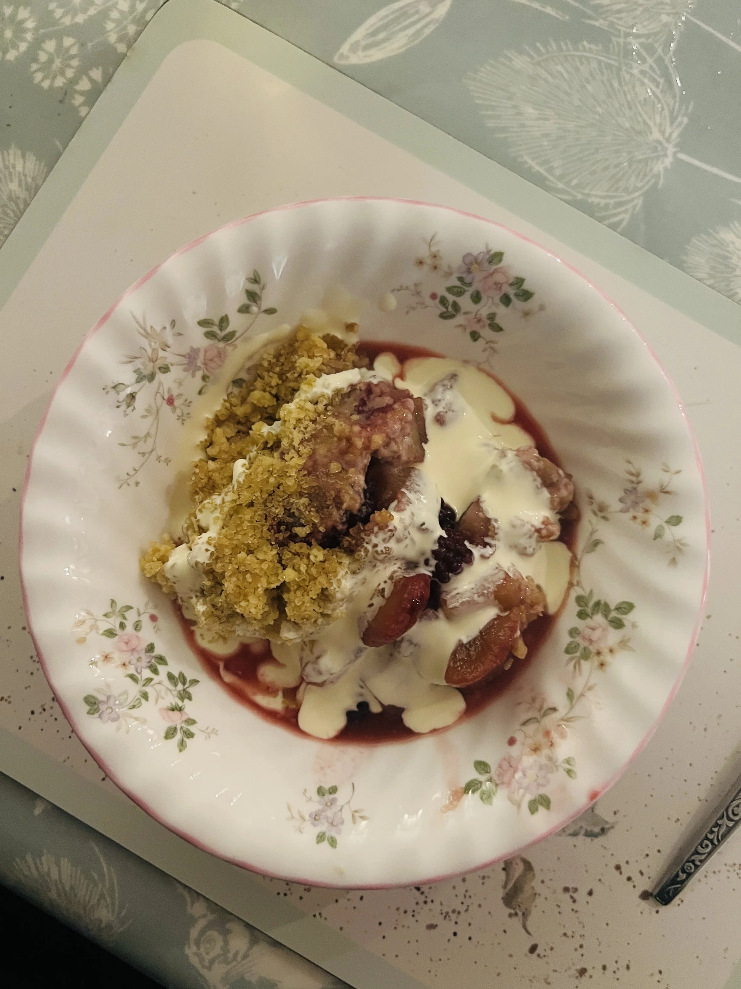 A crumble, with pears and blackberries from the garden, topped with fresh cream. Listen. As full as we ALL were. Not a drop of berry juice was left in our bowls. You can’t beat fresh fruit, especially when it is grown just steps from your kitchen door. Pouring cream directly on a dessert feels like a luxury. I would take that over ice cream any day. Pour that cream over me, those should be the lyrics.