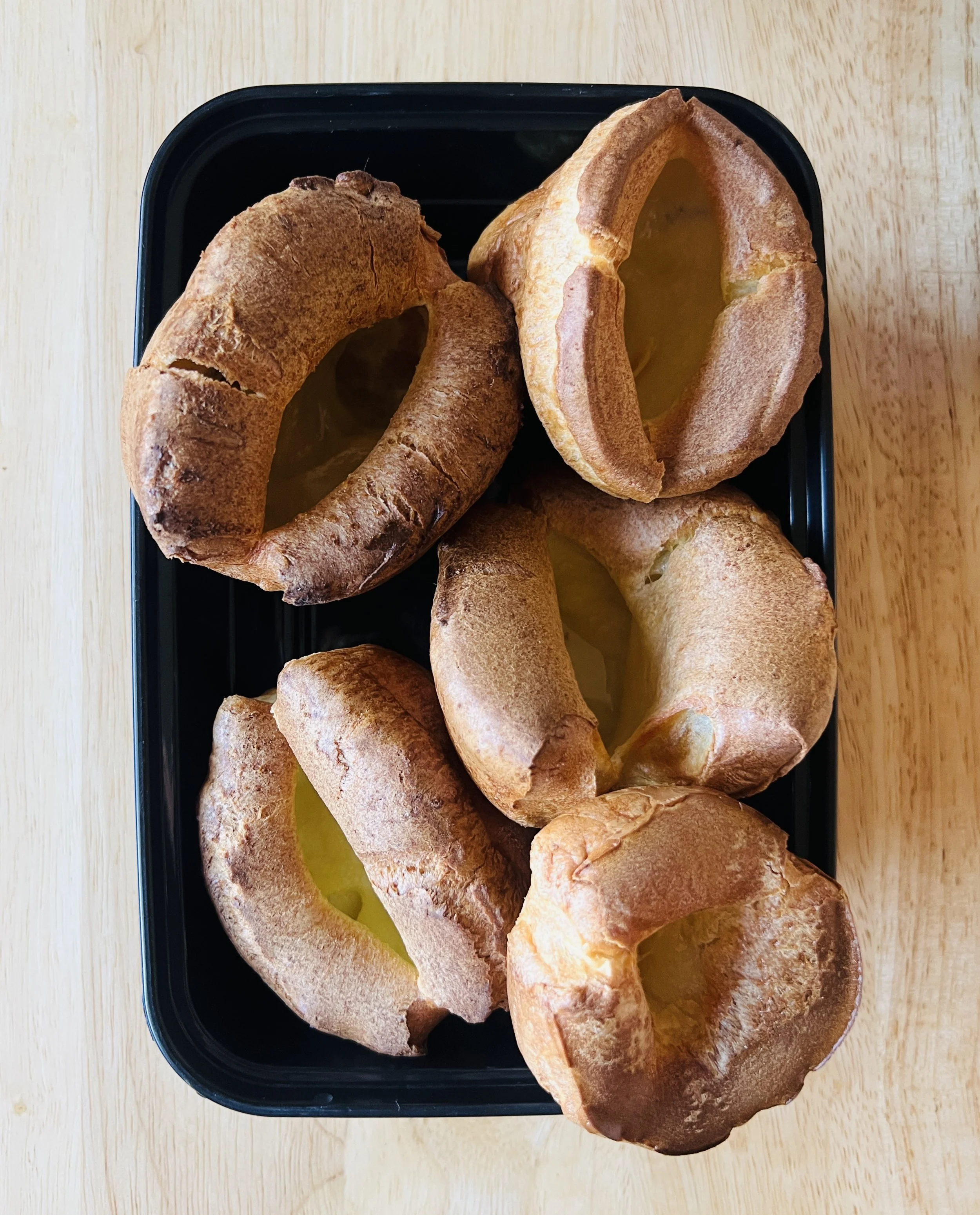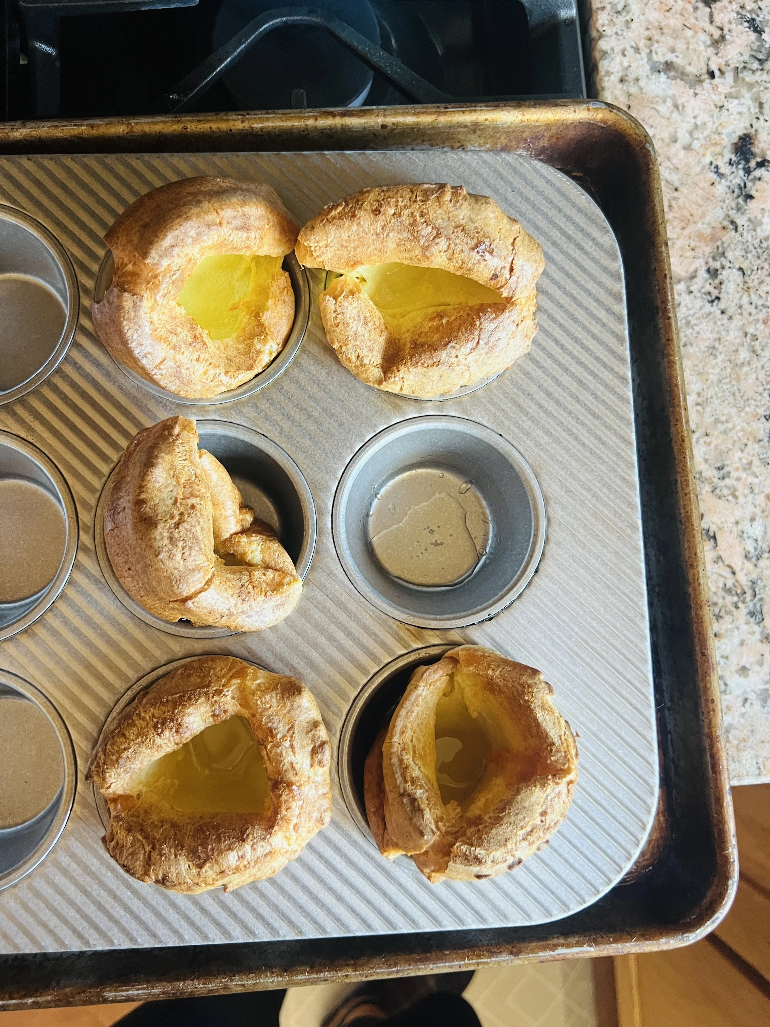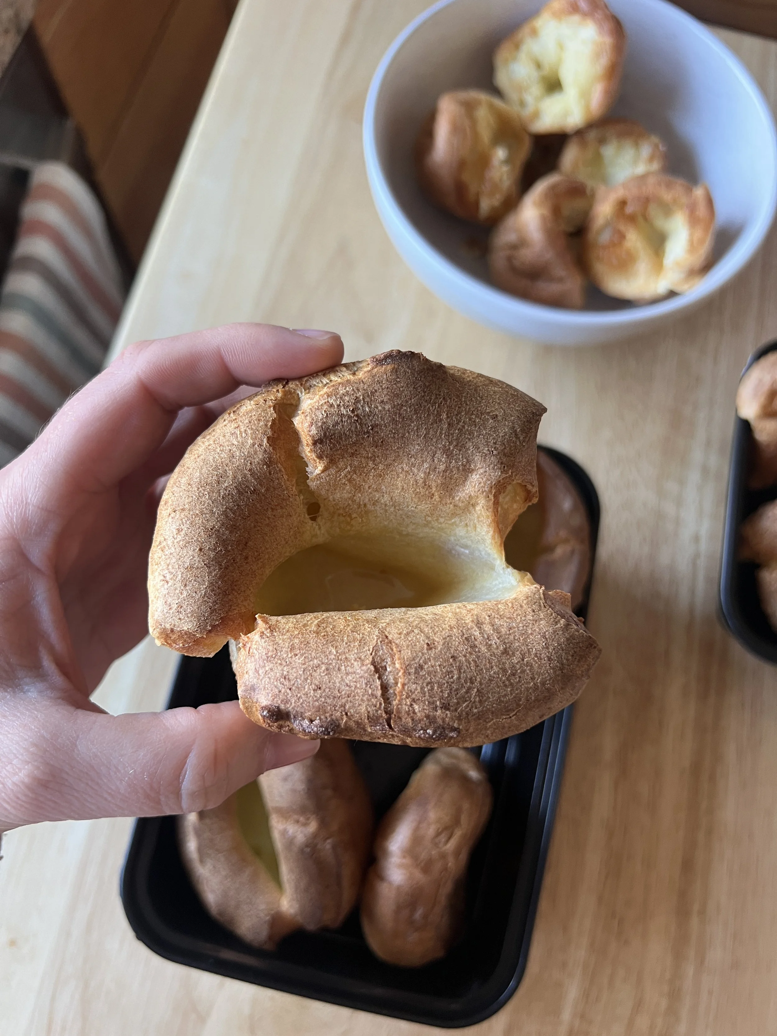 I whipped up the simple batter and preheated my muffin tin. The Yorkies went in. The oven light was on, and I was crouched down, ready to watch the show. A few minutes went by, and nothing happened. I scrolled a little, pet the cat, and when I turned back towards the glowing oven, I saw them. My Yorkshire puddings were rising! I kept watching; it is so fascinating to see baking in action. You don’t get the same instant gratification watching a cinnamon crunch bread bake for 65 minutes 😂, lawn chair out, newspaper in hand, in it for the long game.