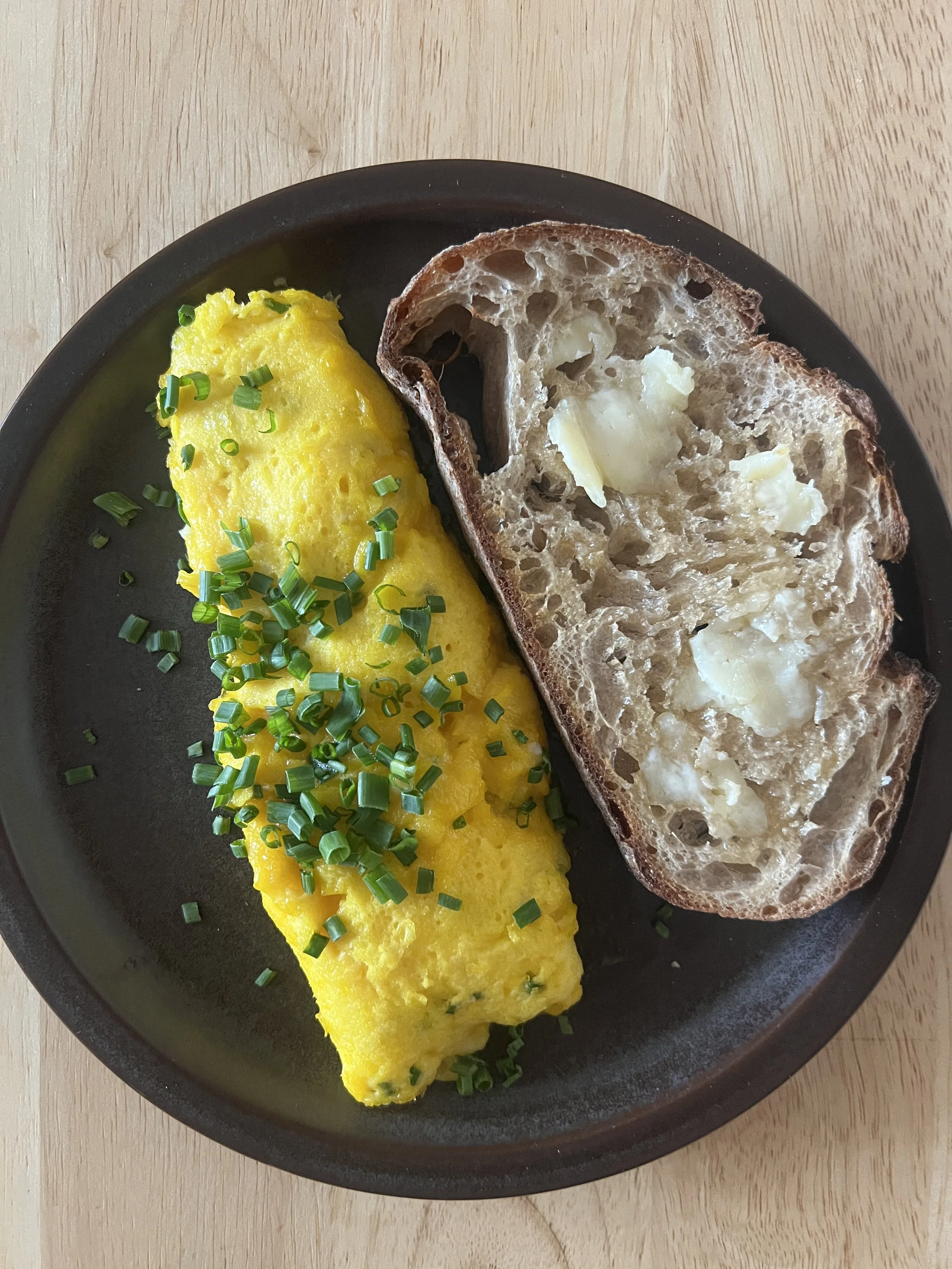 When the eggs are mostly cooked but still a tad wet on top, add your toppings and do your best to fold your omelette. I like the trifold method, but it doesn’t always come out looking picture-perfect. Skip that and just fold the eggs in half. Slide that baby onto a plate and enjoy your soft, supple, creamy omelette. Bonus point if you add chives!